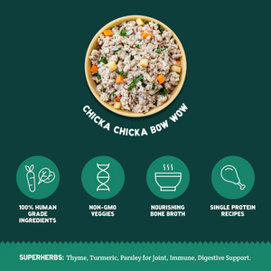 A Pup Above Chicka Chicka Bow Wow Sous Vide Dog Food is a human-grade, grain-friendly food Made with USDA certified chicken and chicken liver and mixed with non-GMO, pesticide-free veggies to make a hearty recipe your pup will love! This low-fact recipe is great for dogs with sensitivities or weight issues. Gently Cooked Sous-Vide for a healthier and more delicious food. 100% Human Grade. Non-GMO Vegetables. Ingredients that are traceable back to the source. Fully Recycable Packaging.