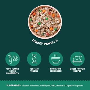 A Pup Above Turkey Pawella Sous Vide Dog Food is a human-grade food Made with USDA certified turkey and turkey liver and mixed with non-GMO, pesticide free veggies to make a hearty recipe your pup will love! This low-fat recipe is great for dogs with sensitivities or weight issues. Gently Cooked Sous-Vide for a healthier and more delicious food. 100% Human Grade. Non-GMO Vegetables. Ingredients that are traceable back to the source. Fully Recycable Packaging.