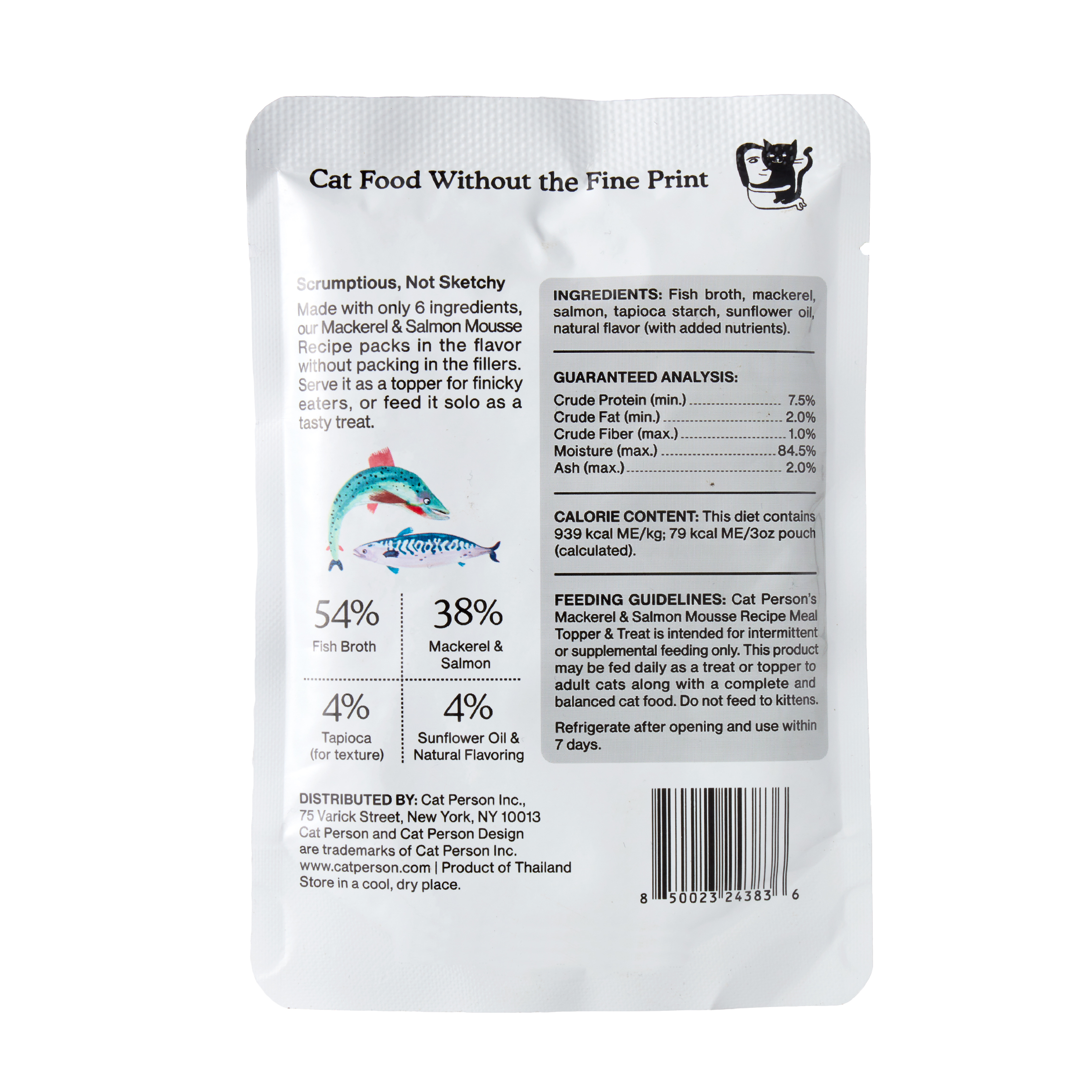 With only 6 simple ingredients, our Mackerel & Salmon Mousse recipe is a flavor explosion that brings the ocean’s best to your cat’s bowl. Its creamy texture makes it a great topper for meals or a satisfying treat for seafood-loving cats.