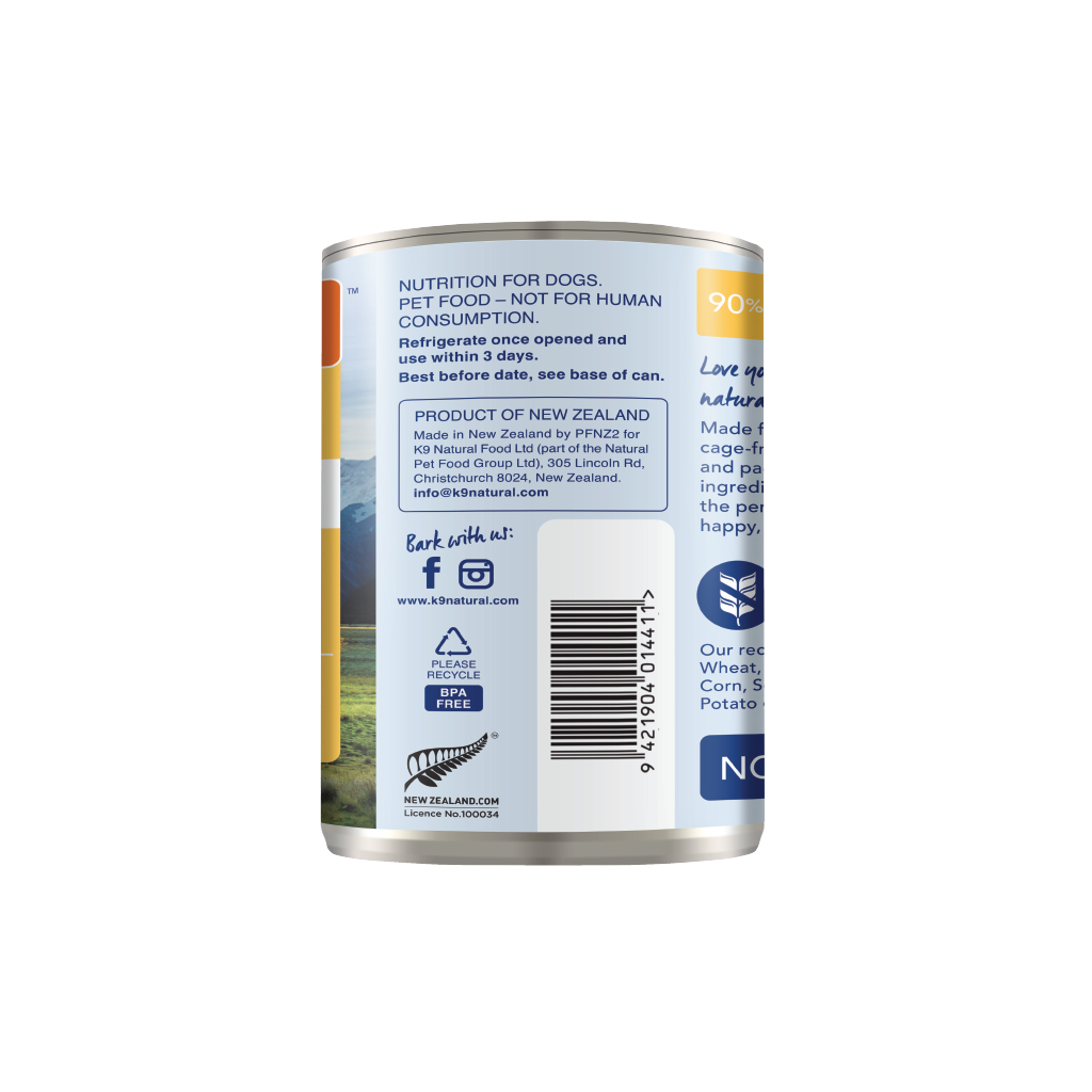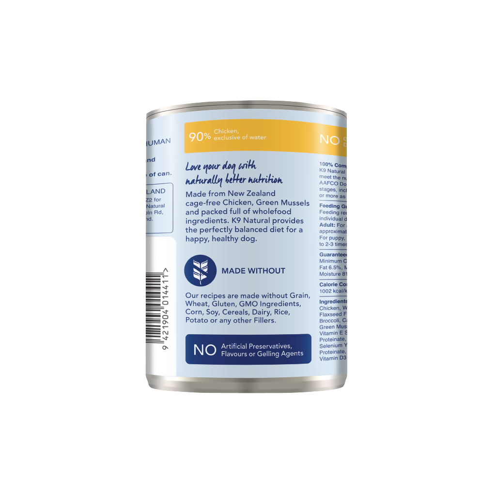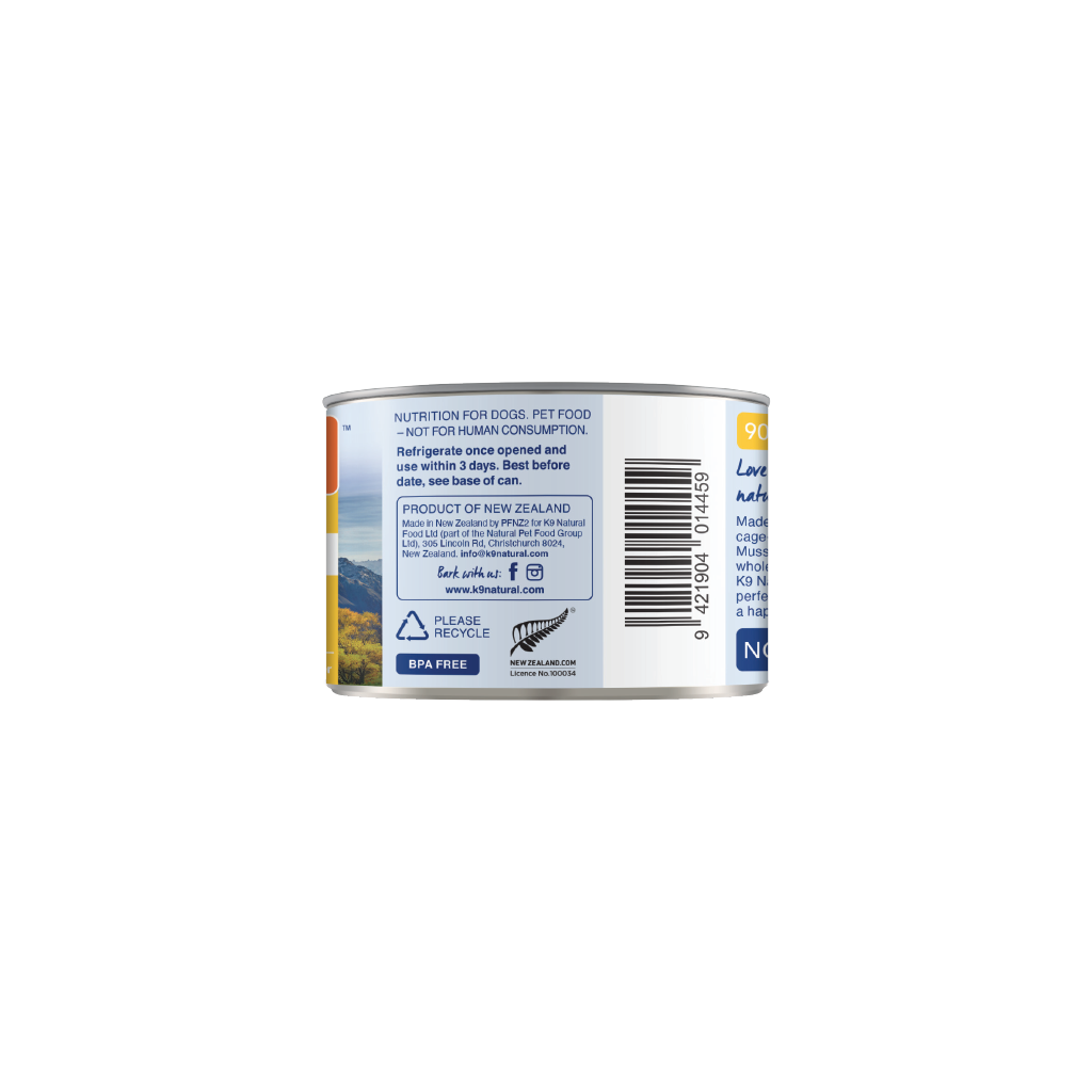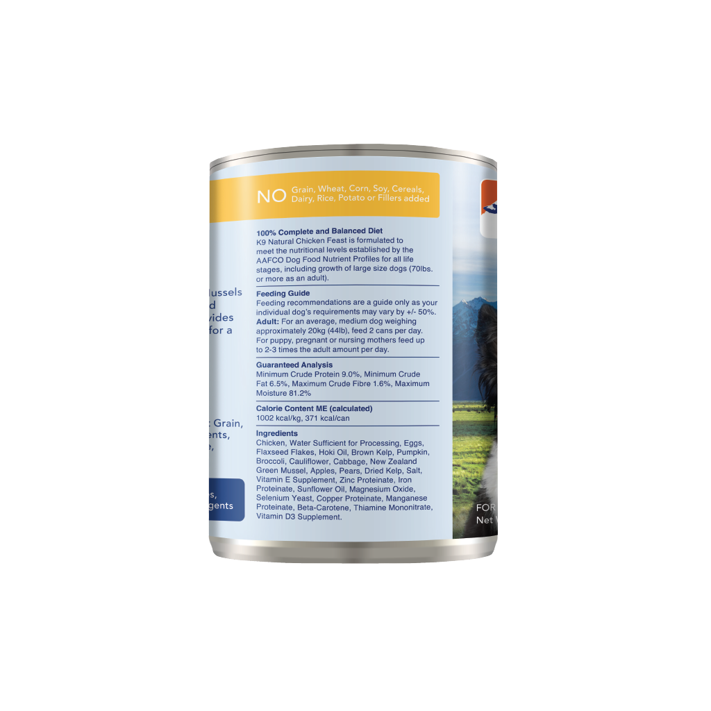 Chicken, Water Sufficient for Processing, Eggs, Flaxseed Flakes, Hoki Oil, Brown Kelp,  Pumpkin, Broccoli, Cauliflower, Cabbage, New Zealand Green Mussel, Apples, Pears, Dried Kelp, Salt, Vitamin E Supplement, Zinc Proteinate, Iron Proteinate, Sunflower Oil, Magnesium Oxide, Selenium Yeast, Copper Proteinate, Manganese Proteinate, Beta-Carotene, Thiamine Mononitrate, Vitamin D3 Supplement.