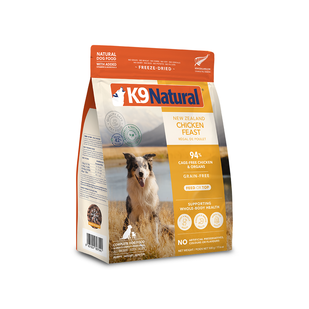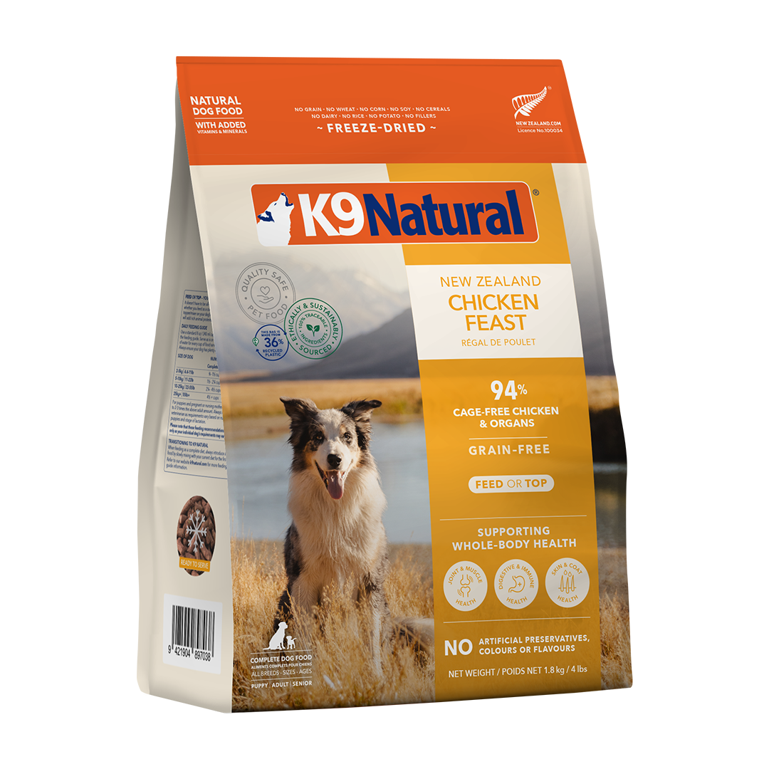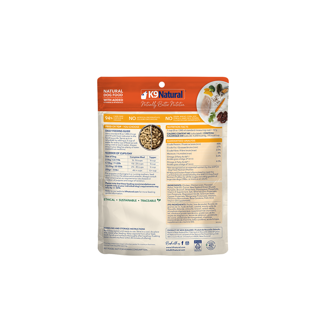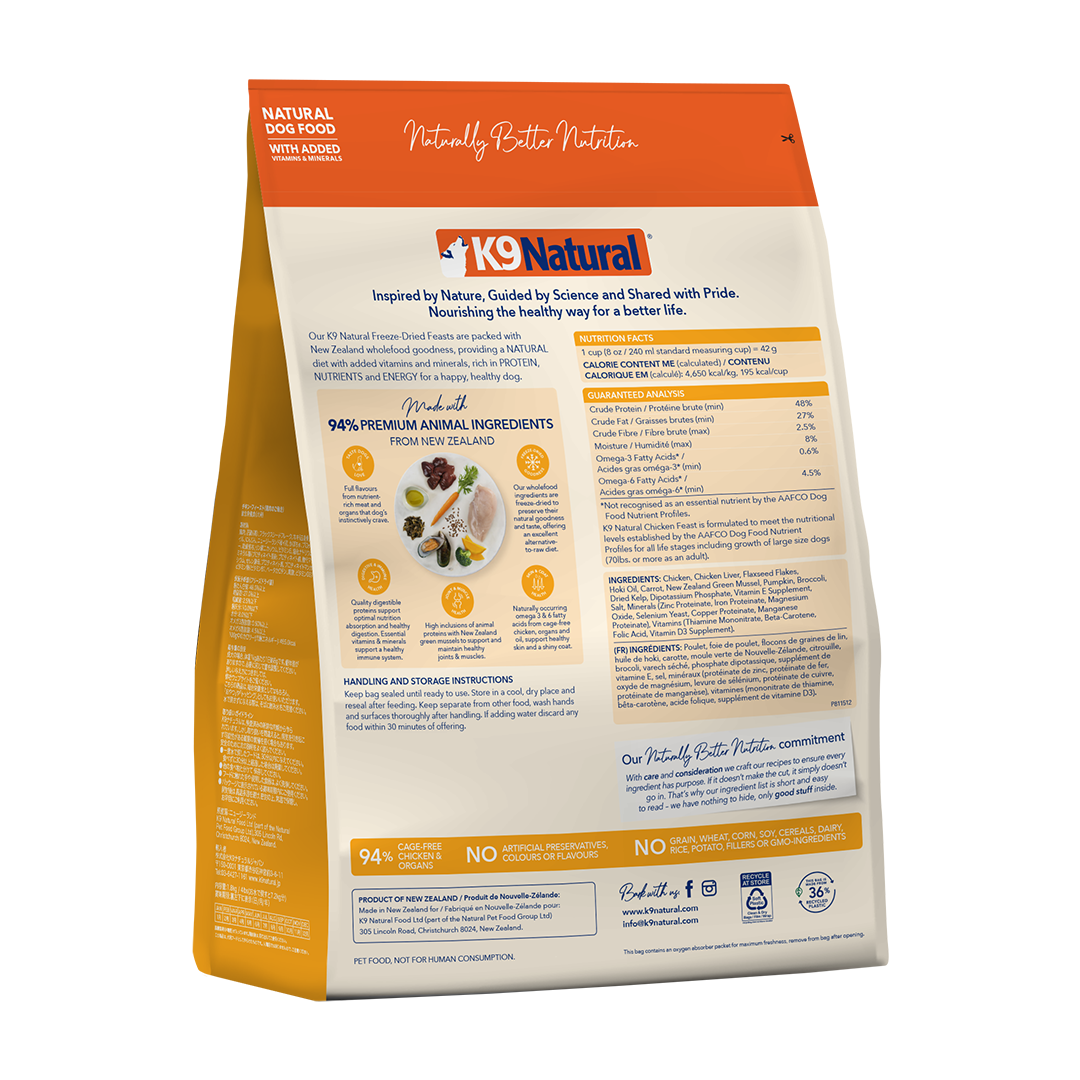 Our complete and balanced Freeze-Dried New Zealand Chicken Feast contains 94% Cage-Free Chicken and Organs with New Zealand Green Mussels, Flaxseed Flakes, Vegetables, Oils, Kelp, Vitamins, and Minerals in support of your dog's whole-body health.