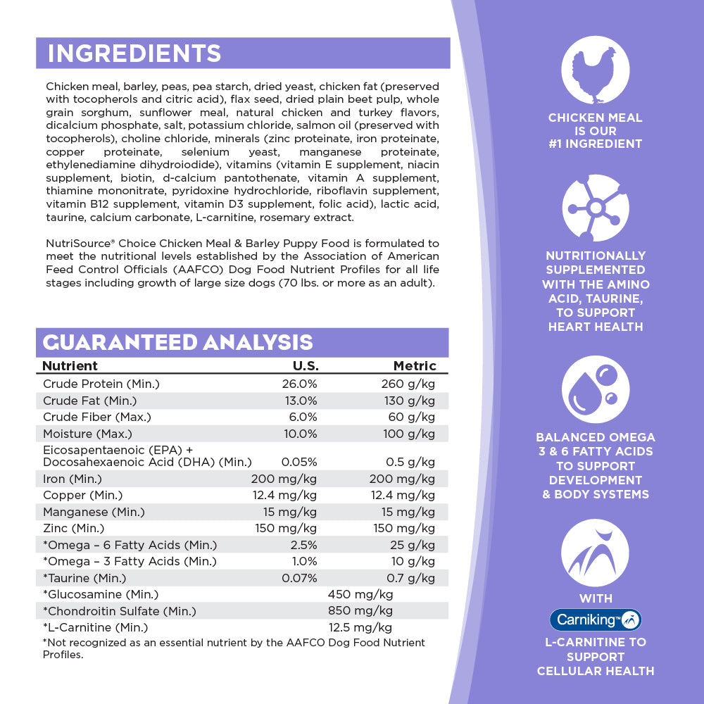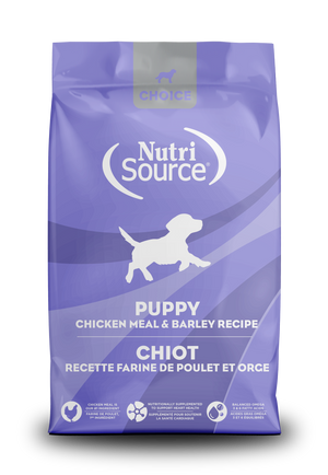 • NutriSource® Choice delivers affordable, compact nutrition to keep your puppy happy, healthy, and thriving every day.  NutriSource® Choice Chicken Puppy Food offers wholesome, protein-packed recipe with chicken meal as the #1 ingredient. Enriched with taurine, choline chloride, and L-Carnitine to promote a strong, healthy heart.  This grain-inclusive formula is enriched with balanced Omega-3 and Omega-6 fatty acids for healthy development, skin, and coat. Health starts here!