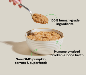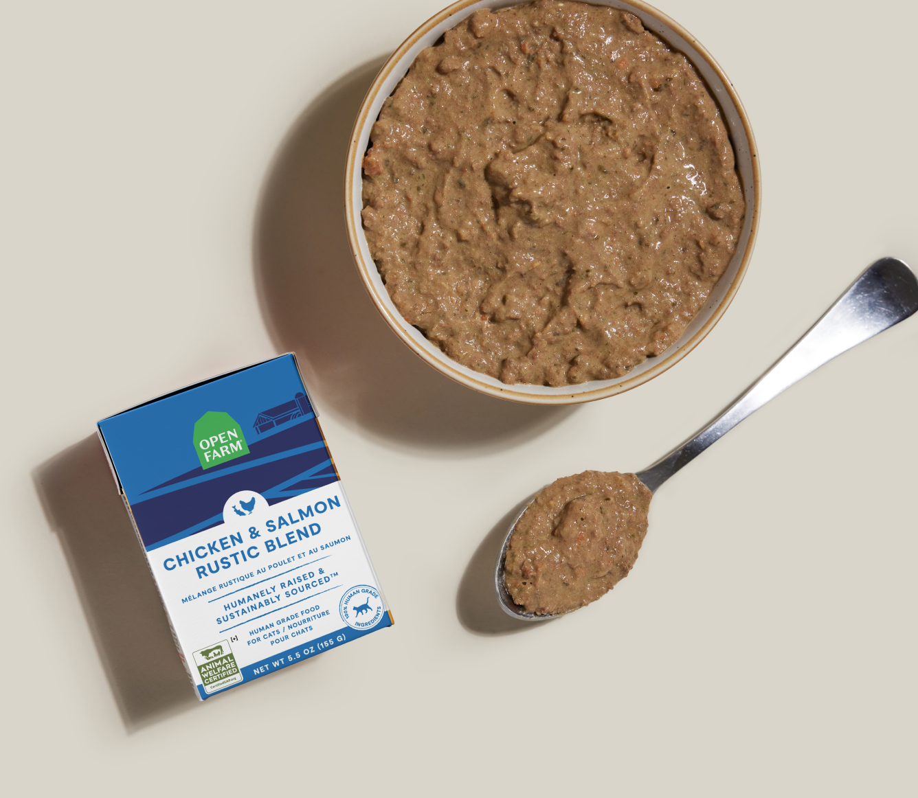 Boost their bowl with a savory blend of Ocean Wise recommended wild-caught salmon, humanely-raised chicken and non-GMO veggies – all human-grade ingredients kettle-cooked to perfection. Mix this juicy rustic blend with your cat's meal or serve alone as a complete and balanced diet.