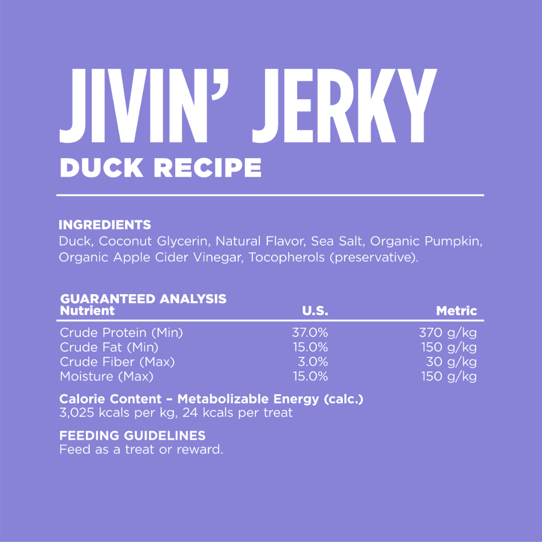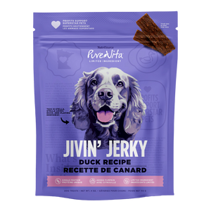 • NutriSource PureVita Duck Jivin’ Jerky is the perfect treat for your dog, combining high-quality protein with added pumpkin for a nourishing and delicious snack. Featuring a limited ingredient recipe with duck as the #1 ingredient, these single-protein jerky treats are ideal for pups with sensitive stomachs or discerning tastes. Whether used as a reward or daily treat, your dog will crave every bite. Plus, every purchase supports Superstar pets, making it a choice you and your pet can feel great about. Crafted with care, because your dog deserves the best.