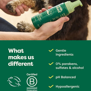 A no-rinse dog shampoo, for all coat types, that combats odor and hydrates the skin and coat - without the need for a bath.