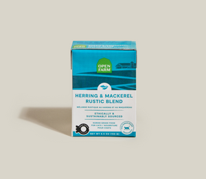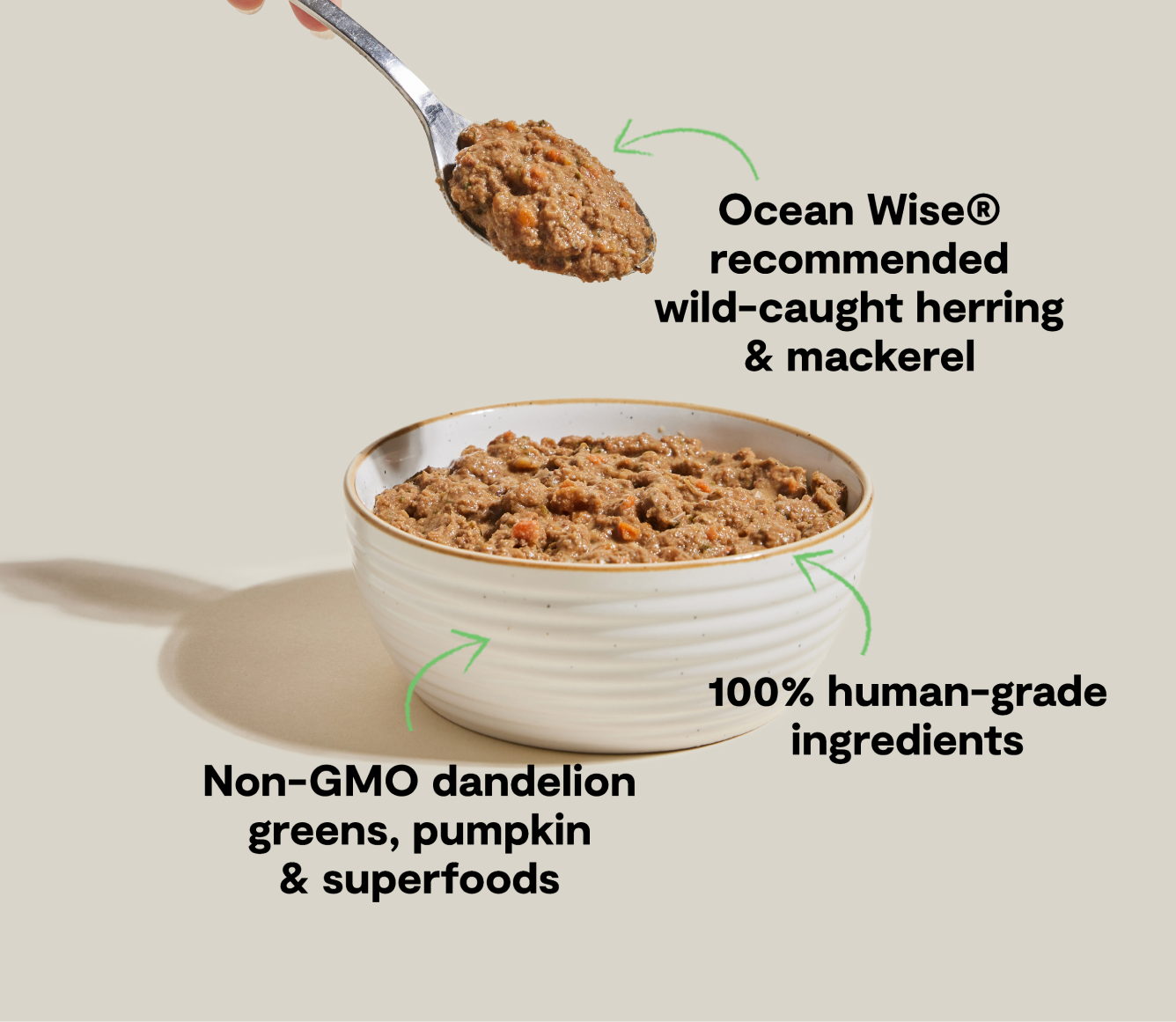Boost their bowl with a savory blend of Ocean Wise recommended wild-caught herring, mackerel, and non-GMO veggies – all human-grade ingredients kettle-cooked to perfection. Mix this juicy rustic blend with your cat's meal.