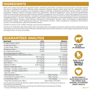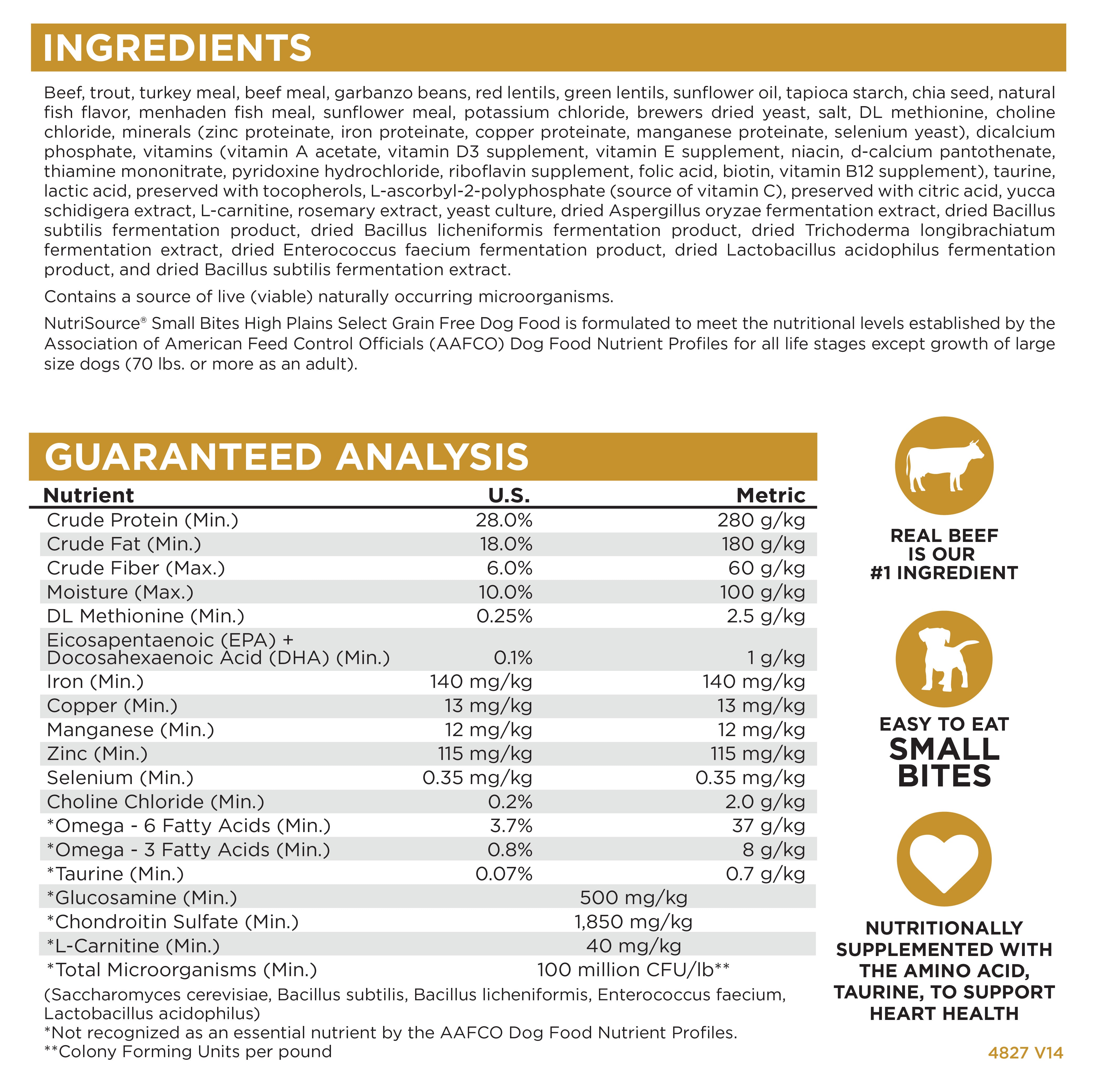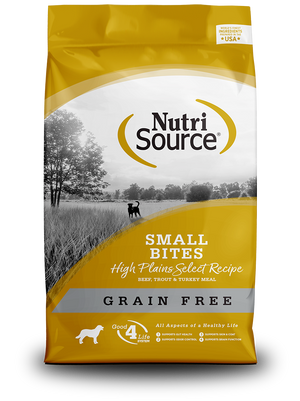 • NutriSource® Small Bites High Plains Select Recipe Grain Free Dog Food is a scientifically formulated, easy-to-digest food. Real beef is the number one ingredient. Beef has a rich, wholesome taste dogs love and is a source of high quality protein that helps maintain muscle mass and strength. Our blend of beef, trout, turkey meal and carefully selected ingredients help balance essential nutrients necessary for health and well being for your furry friend. Feed with confidence knowing that you’re part of a family that loves your pets just as much as you do. Health begins here.
