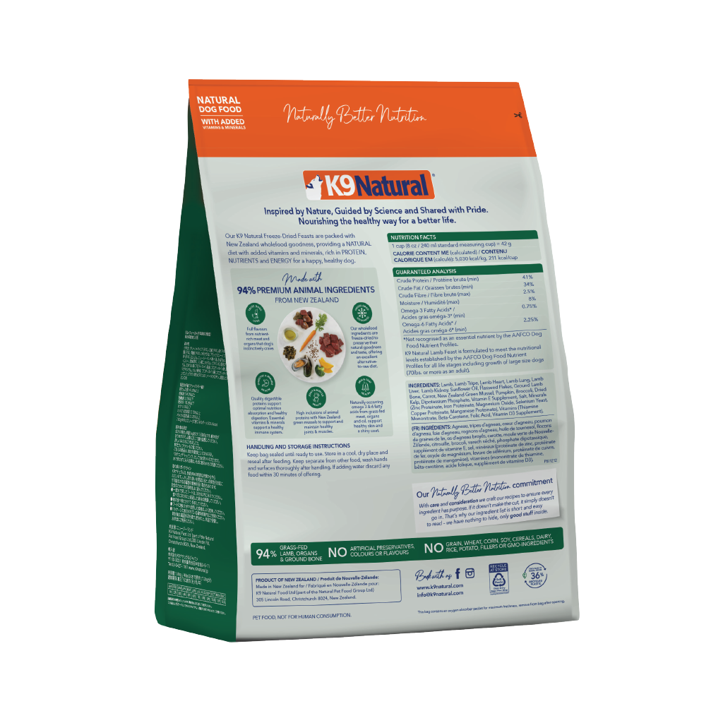 Our complete and balanced Freeze-Dried New Zealand Lamb Feast contains 94% Grass-fed & Grass-finished Lamb & Organs and Ground Bone, with New Zealand Green Mussels, Flaxseed Flakes, Vegetables, Oils, Kelp, Vitamins, and Minerals in support of your dog's whole-body health.