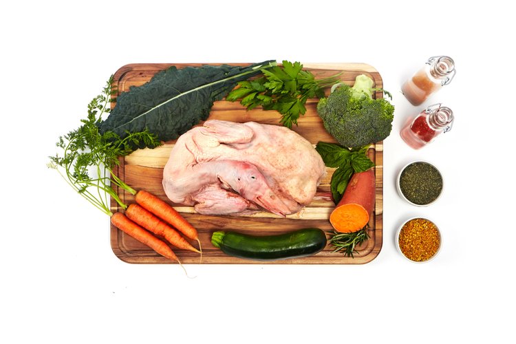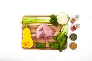 Rabbit (with ground bone), Rabbit, Organic Butternut Squash, Organic Celery, Organic Green Beans, Organic Cauliflower, Organic Bok Choy, Organic Dandelion Greens, Rabbit Liver, Organic Apple Cider Vinegar, Organic Kelp, Organic Cilantro, Cod Liver Oil, Organic Blueberries, Organic Cilantro, Organic Chia Seeds, Organic Wheatgrass, Vitamin E Supplement, Organic Oregano