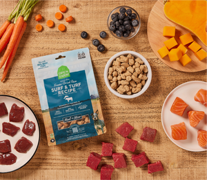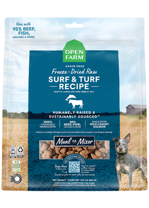 The benefits of pure raw nutrition meet the convenience of freeze dried in this protein-packed recipe of 95% Ocean Wise recommended salmon and pasture-raised beef, organ, and bone. Finished with organic veggies and superfoods, these bite-sized morsels can be an irresistible complete and balanced meal or tasty meal-mixer that boosts their bowl with protein-packed nutrition!