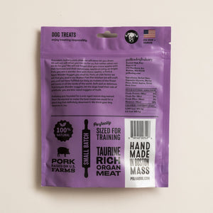 Succulent buttery pork chop, we will never let you down. We will not ask what you do for us. What can we do for you? We will not forget you crave apples both tart and sweet, so juicy, so bright. O Pork! O Apple! Pork & Apple Wonder Nugget you shall be! Pork, at US farms we will find you, and in our Boston Fish Pier kitchen we will craft you, fulfilling our duty as makers of the finest pet treats in all the lands of the earth. O soft gentle bites: the Dog howls with gratitude!